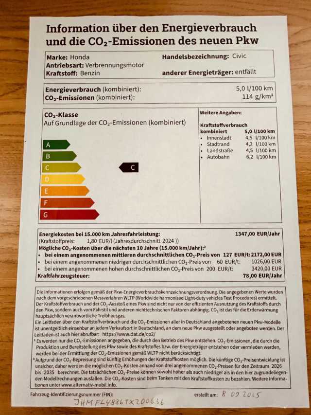 Honda Civic e:HEV 2.0 i-MMD Hybrid Advance 39.900 €MwSt. ausw.VergleichenFavoritDetails 6.000 km01.2026Super105 kW/143 PSWeißAutomatikVorführfahrzeugLederausstattung5 TürenNavigationssystem Energieverbrauch kombiniert: 5,0 l/100kmCO₂-Emissionen kombiniert: 114 g/kmCO₂-Klasse: CInformation über den Energieverbrauch und die CO₂-Emissionen des neuen PKW