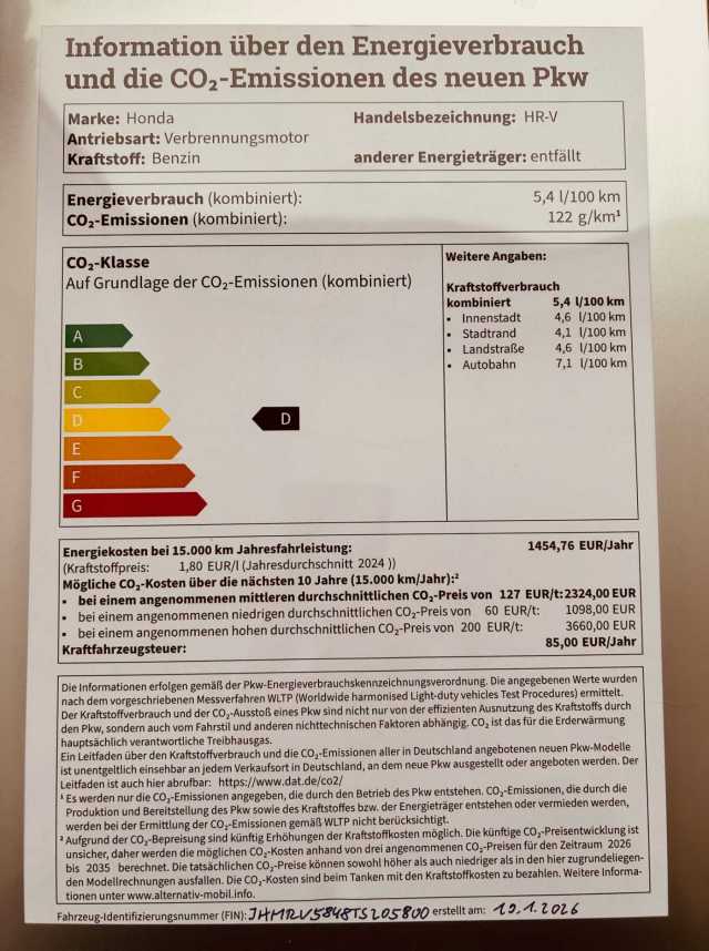 Honda HR-V Hybrid e:HEV 1.5 i-MMD Advance 32.990 €MwSt. ausw.VergleichenFavoritDetails 6.000 km01.2026Super79 kW/107 PSGrünAutomatikVorführfahrzeug5 TürenNavigationssystem Energieverbrauch kombiniert: 5,4 l/100kmCO₂-Emissionen kombiniert: 122 g/kmCO₂-Klasse: DInformation über den Energieverbrauch und die CO₂-Emissionen des neuen PKW